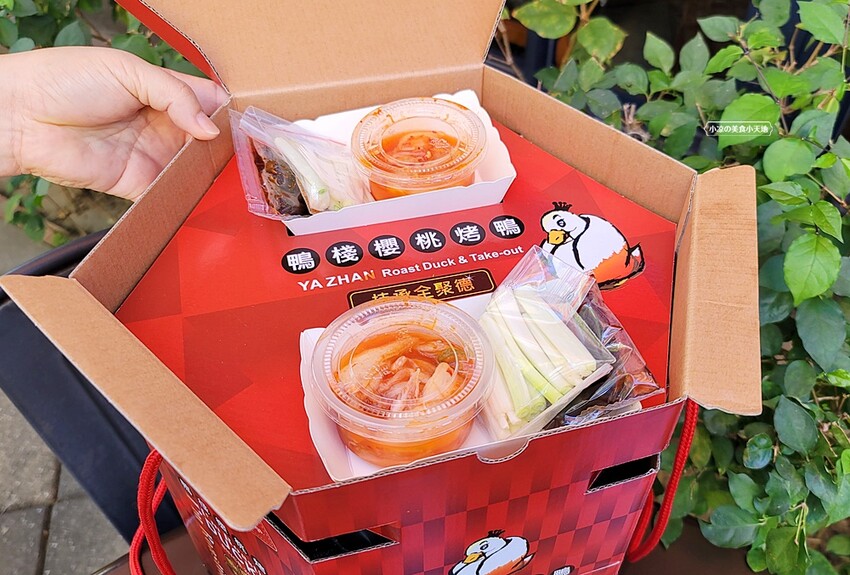 而且這提盒經過店家巧思的設計,你都不用擔心食物會在帶回家的過程中倒掉呢,首先是店家搭配烤鴨的調味配料有甜麵醬、蔥段、招牌泡菜、銷魂辣粉,如果覺得泡菜很合口味,下一次購買時可以直接買大罐的回家唷!