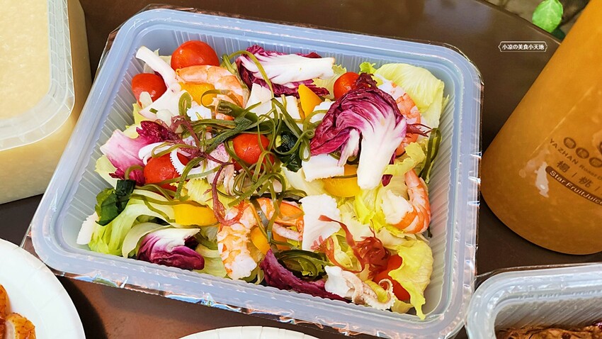 四季彩鮮沙拉(附和風油醋醬),滿滿的生菜、彩椒、海帶絲、番茄之外,還有章魚、白蝦等海鮮,整體的配色相當繽紛更給人開胃的視覺。