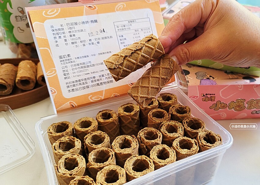 巴部屋小捲餅-烏龍,嚴選南投竹山、鹿谷一帶的烏龍茶葉,經由炭焙過後的茶葉,研磨成粉末狀烤成脆餅,小捲餅上隱約都有著黑點(那就是茶葉),入嘴香酥可口,清新典雅的茶香綻放於唇齒,再搭配一杯好茶更是幸福~