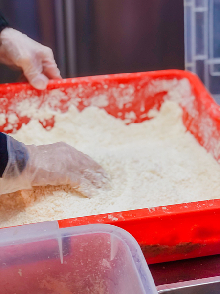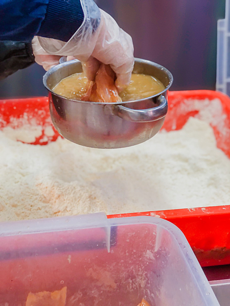 不論是杏鮑菇、花枝丸都會先裹粉之後再下去炸,