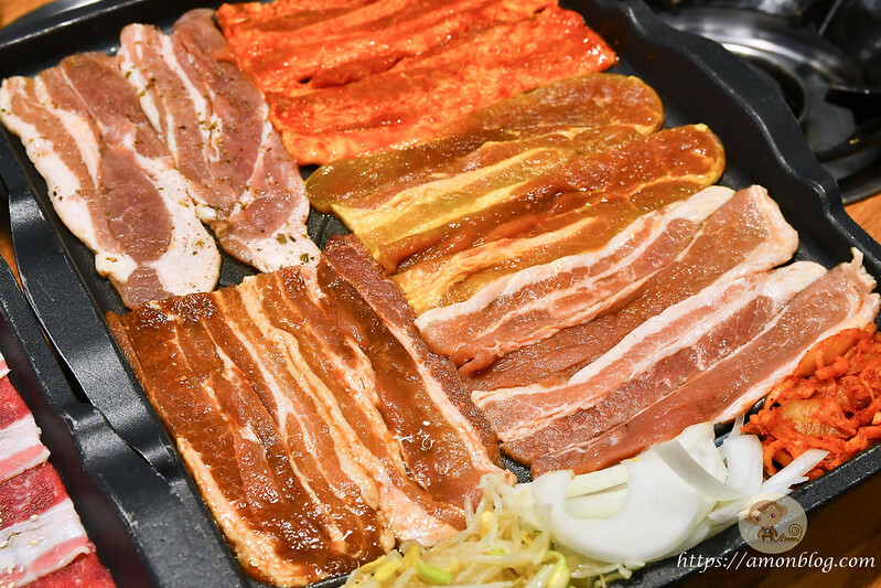 烤肉盤都會有附贈三樣蔬菜,分別是豆芽菜、洋蔥、韓國泡菜,吃完後還可以免費續一次,將泡菜跟燒肉包夾在一起放到白飯上,就成一碗泡菜燒肉丼了XD,如果想要營養均衡點,也可以加價購買生菜來包烤肉一起吃喔。