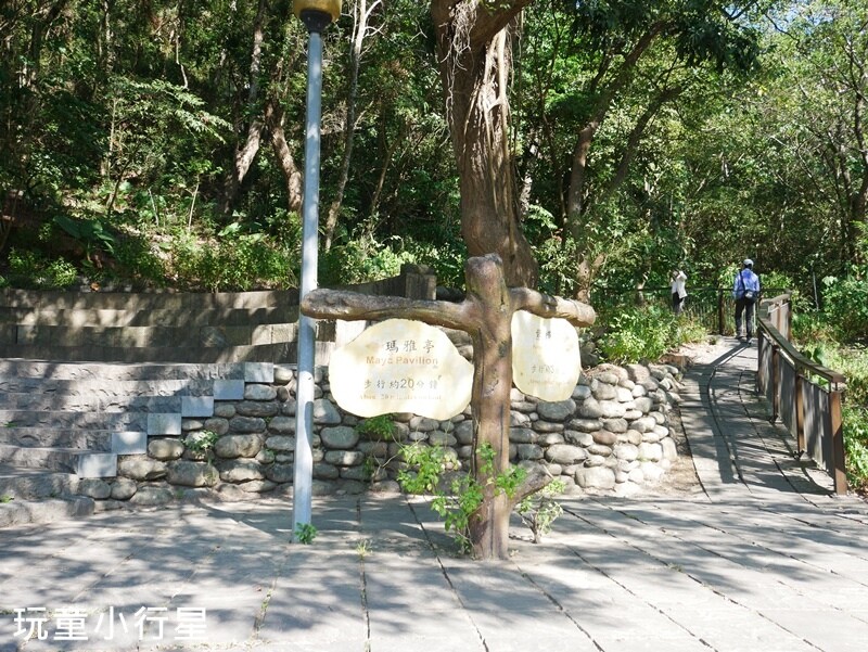步道入口處即有標示牌,往左走約20分鐘可以到最高點瑪雅亭,往右走3分鐘可到紫蝶亭。