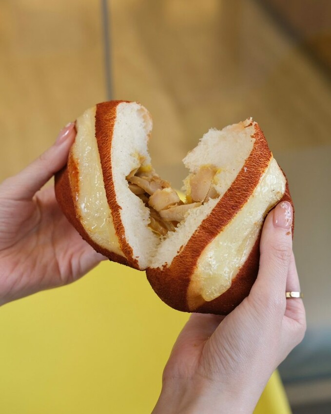▼匈牙利切達燻雞鬆軟中帶點空氣感,起司與美乃滋在表層散發香氣,裏頭吃得到燻雞和起司,鹹香鹹香很開胃~