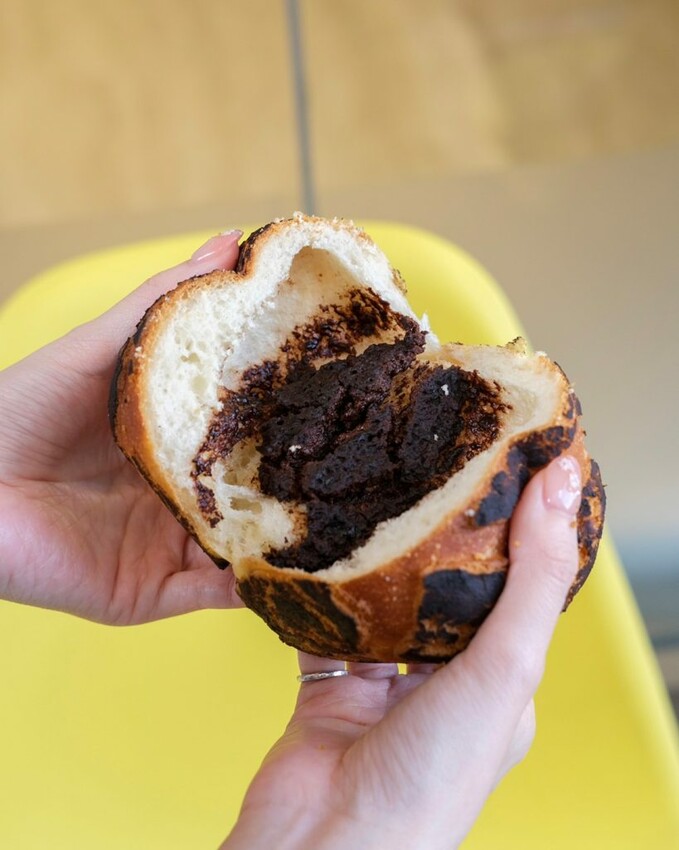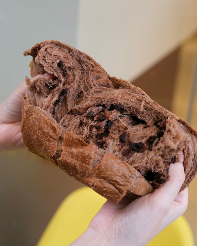 ▼選用法國進口法芙娜巧克力,融入主廚特製的生吐司麵團,咬起來濕潤不乾口,滿嘴都是香濃的巧克力香氣,還能吃到帶有巧克力豆顆粒!