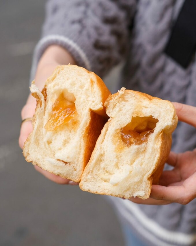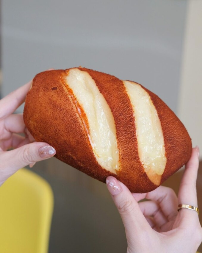 ▼剛出爐冒著煙的現夯⽜奶棒,酥脆的外皮充滿甜香,咬開能看到一層接一層密不可分,嚼勁層次感十足!