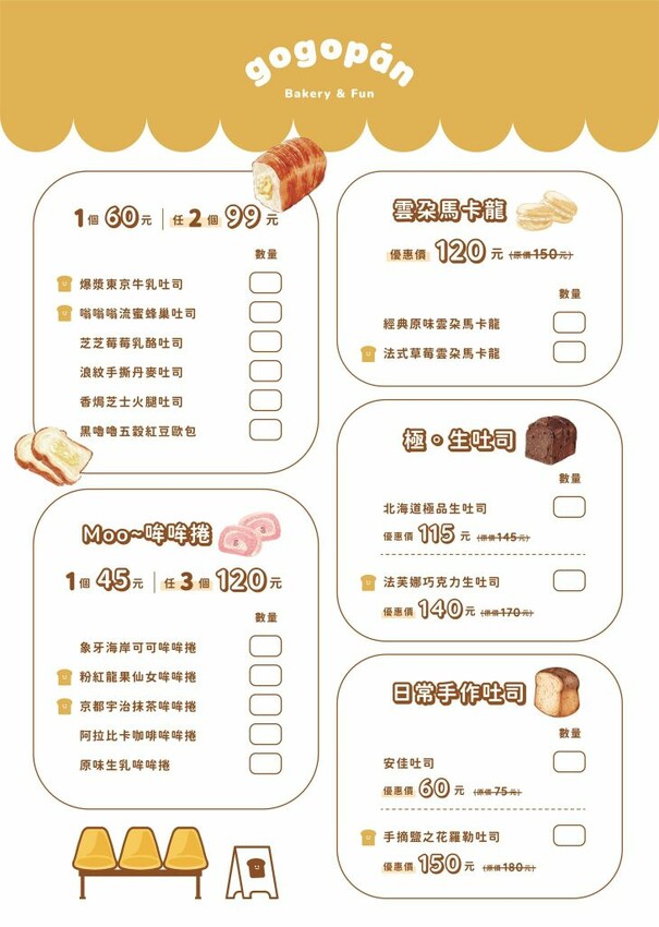 【gogopan元氣麵包社】以新鮮出爐的麵包為主打,從熱門的生吐司到傳統的蔥麵包都有,品項價位介於33元~150元之間,一次買多個還能再享有折扣,最低只要一百元就能帶走四個麵包!