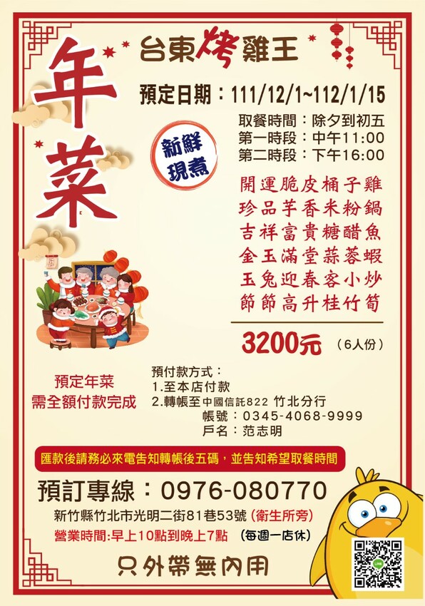 新鮮現烤桶仔雞和現做料理,需要提前電話預約或掃QR code訂購