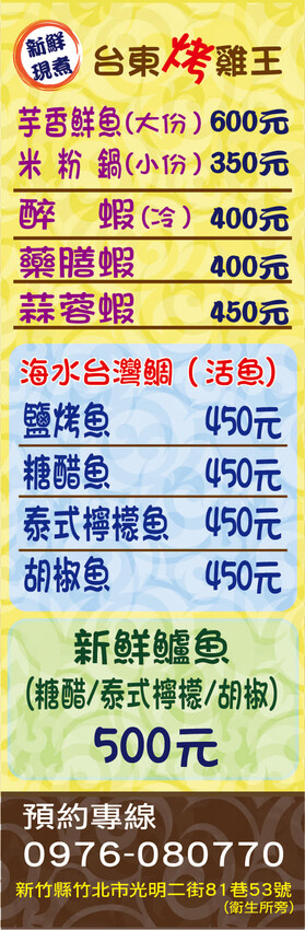台東烤雞王位於光明二街81巷,靠近竹北市衛生所和北崙公園。