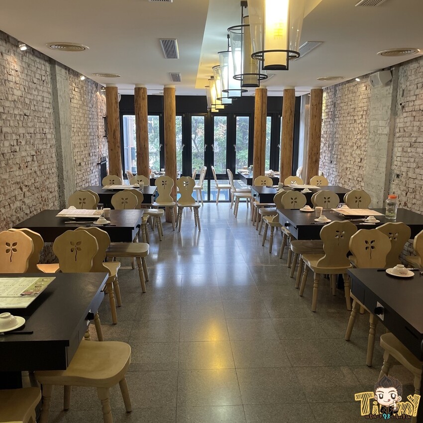 竹北店有兩層樓的用餐空間,以木頭和磚牆營造簡約風格並以花朵作為點綴。