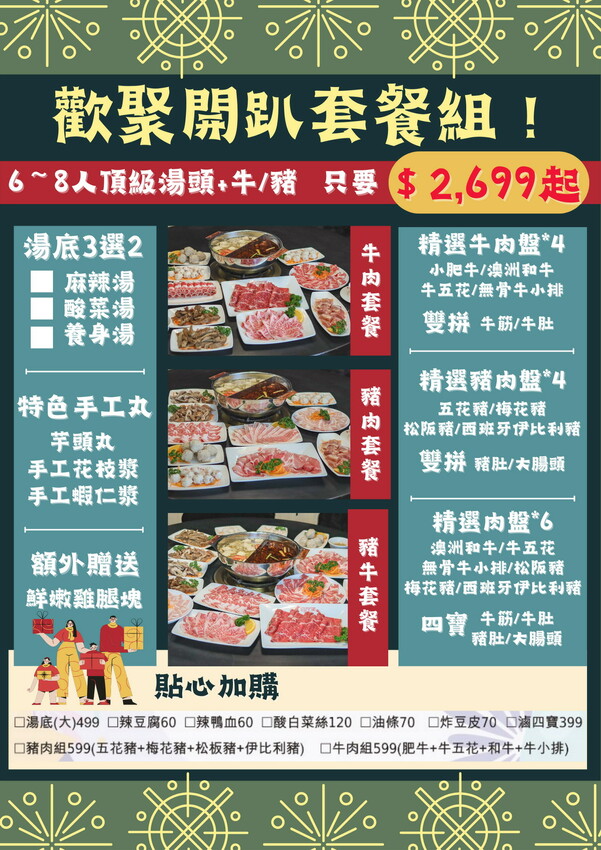 歡樂團聚開趴組有牛肉2699 元,豬肉2699元 ,牛➕豬2999元 3種套餐可以選擇