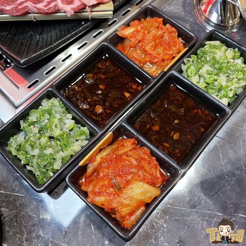五種每天現做的獨家佐料,有和風洋蔥醬、蒜片、泡菜、蔥鹽醬、柚鹽,可以提升燒肉的風味喔