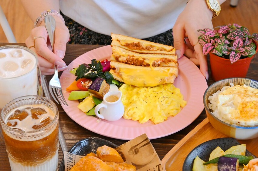 如果有想換其他飲料還可折抵20元。吐司裡還有包酸甜番茄豬絞肉餡,裹上爆濃起司,再加上外酥內軟奶香吐司,用料之實在好吃度更不用說。一旁還有沙拉、軟嫩炒蛋,整體相當有份量。