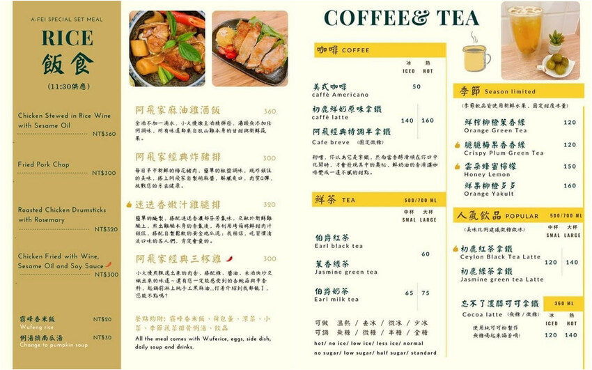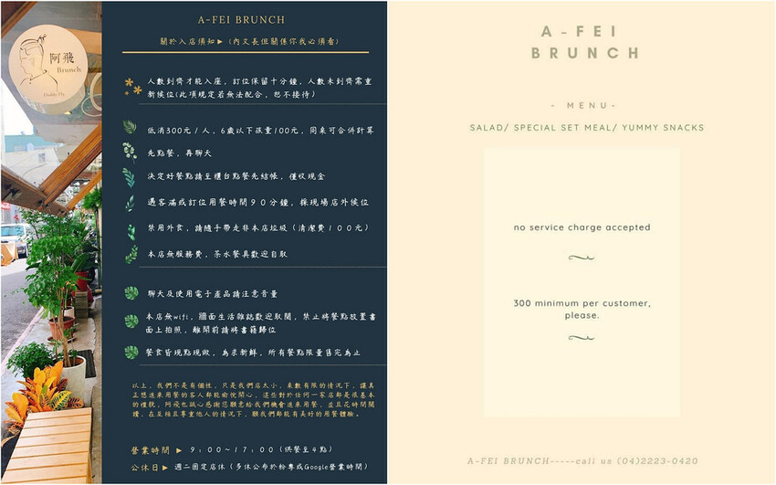 阿飛餐點以早午餐和招牌飯食兩大類為主,低消是300元,但少見的不收服務費,但如果店內客滿的話有限1.5小時用餐時間,另外還有規定人數到齊才能入座。只是餐點都是現點現做,所以也要耐心等待不要急。
