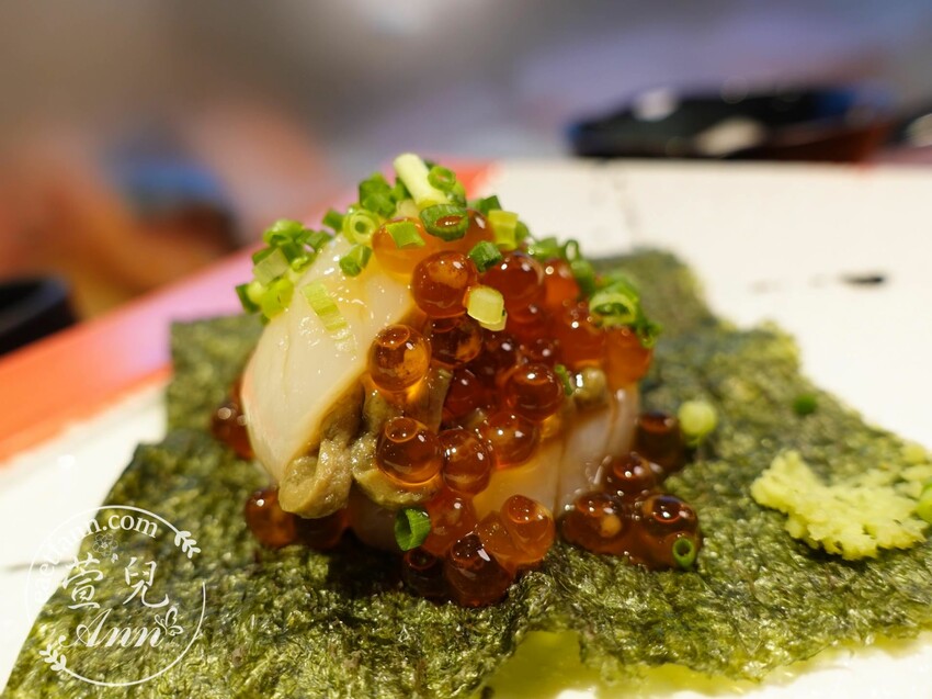 大干貝裡面是 『松葉蟹膏』,並搭配鮭魚卵與日本空運來台的萬能蔥