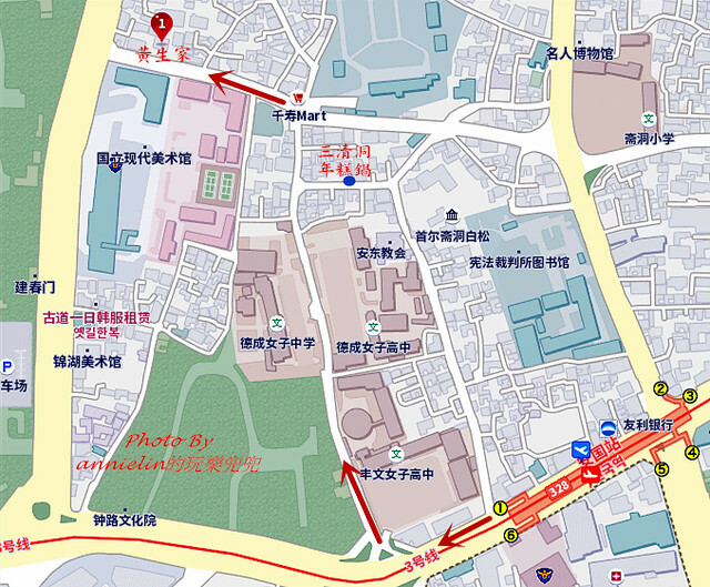 從地鐵3號線-安國站1號出口,往三清洞的方向走大約十分鐘的路程!