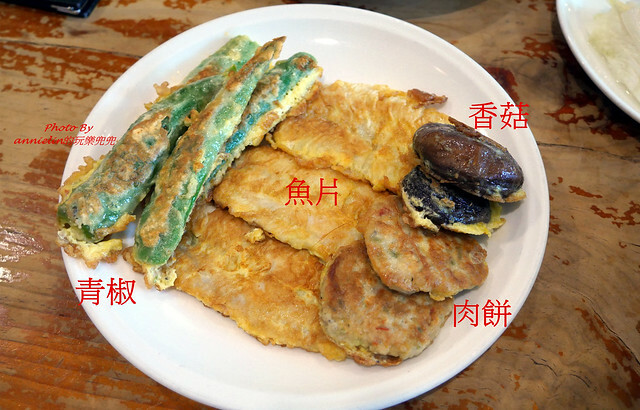 加點的綜合煎餅,有青椒,魚片,肉餅和香菇,