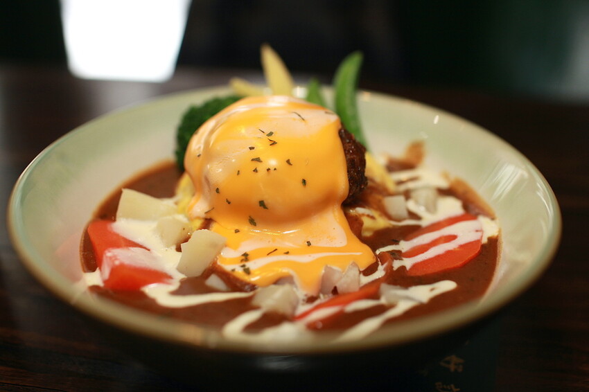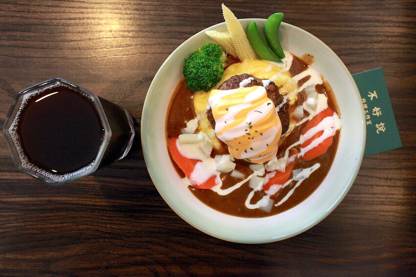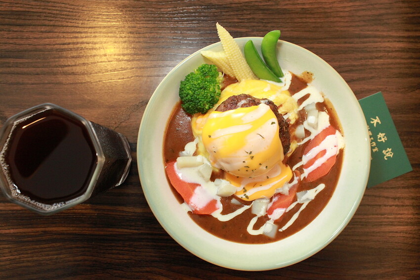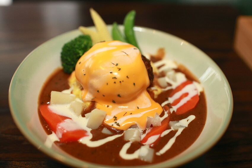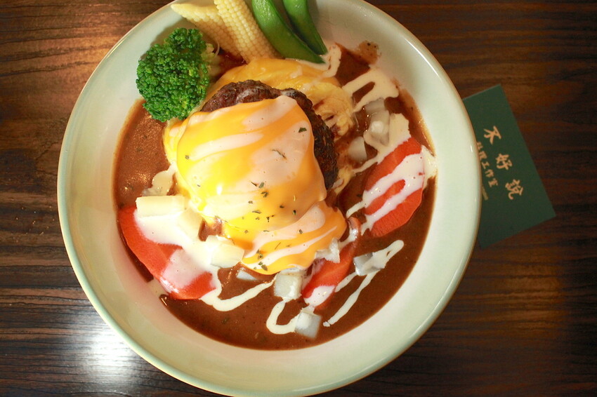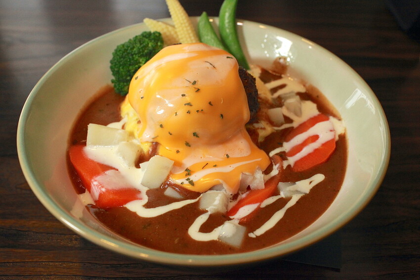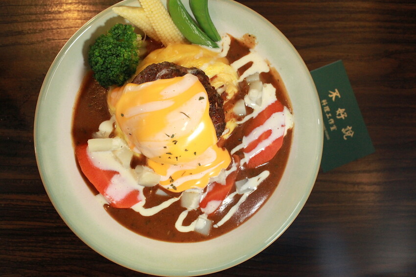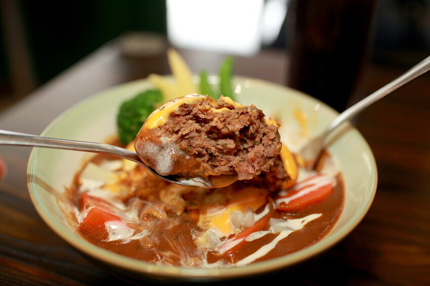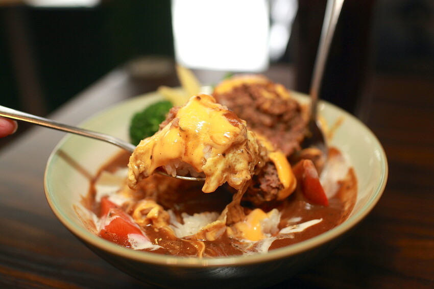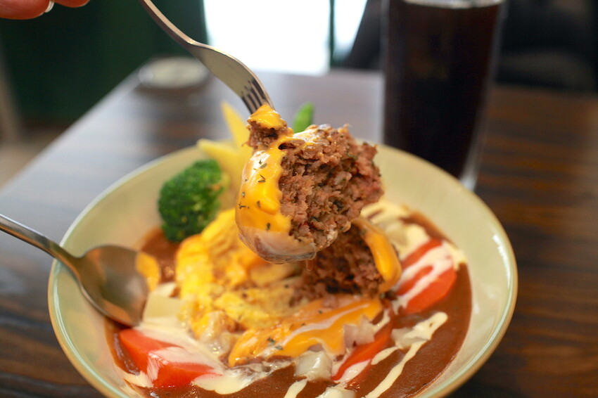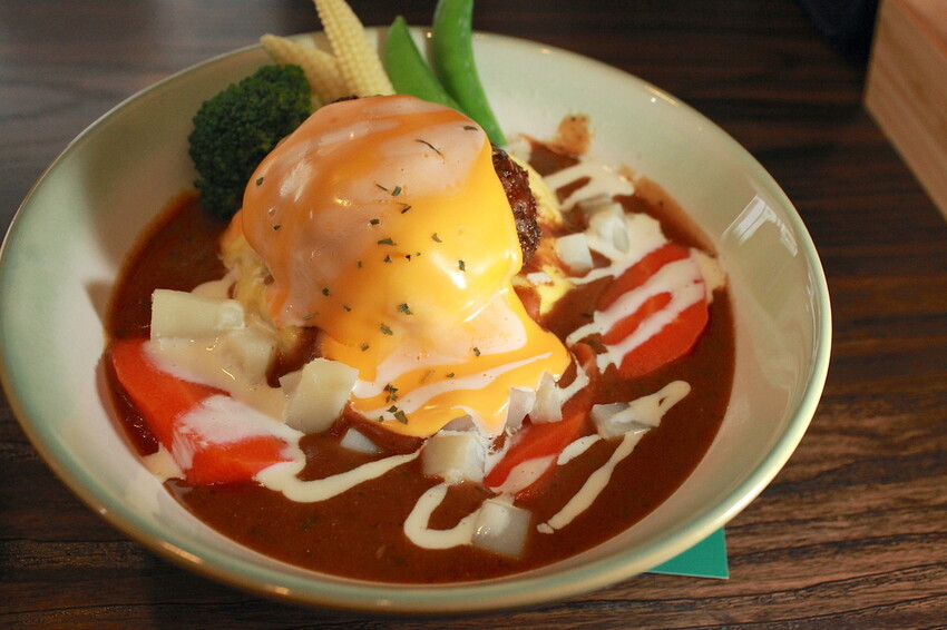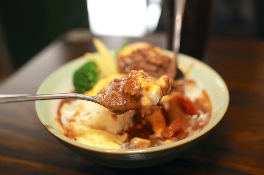 這秘製漢堡排要烹調是相當費工,底部是粒粒分明的軟Q米飯,上面淋上深咖啡色咖哩醬汁,鋪上漢堡排歐姆蛋及融化起司,再點綴一些蔬菜調合咖哩滋味。