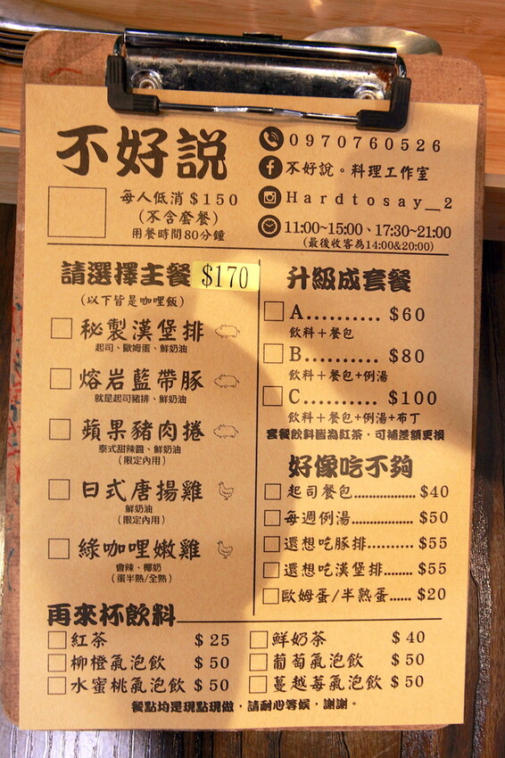 這張是店家點菜單供顧客自行畫選,菜單上五種咖哩主菜供選擇,這五種主菜均一價是170元,也可以選擇加價升級套餐,還有一些單點菜色供額外選擇。