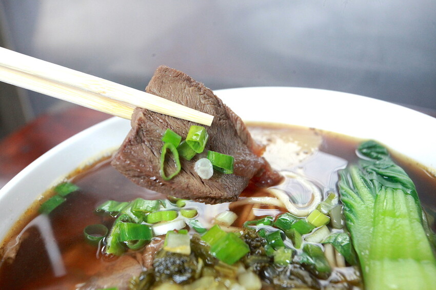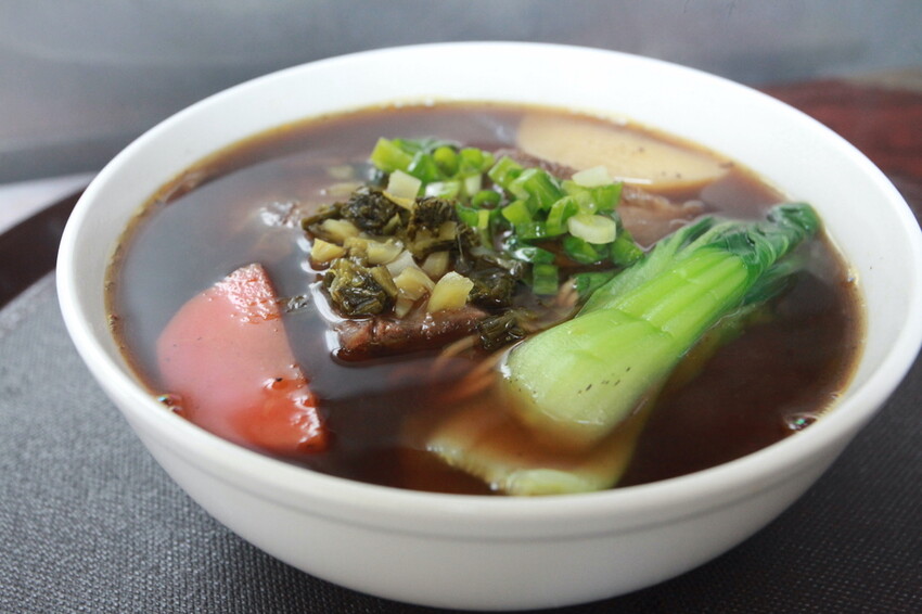 牛肉麵表面看到不會油膩膩的感受,有牛肉、紅蘿蔔、白蘿蔔、湯匙菜、蔥花及酸菜等食材。