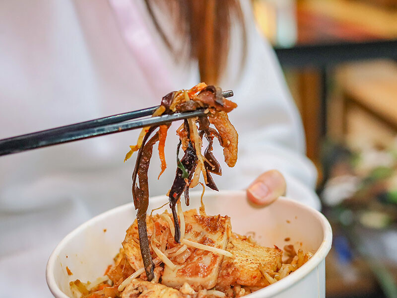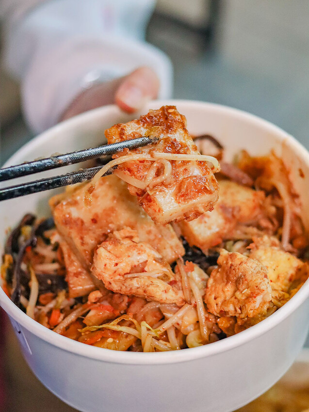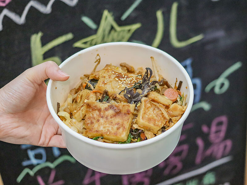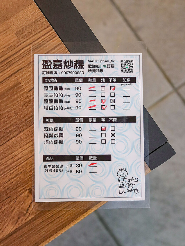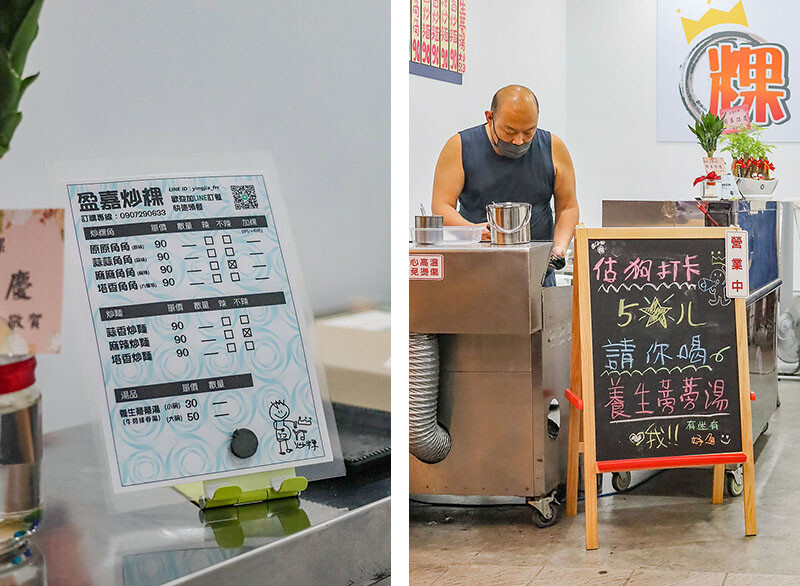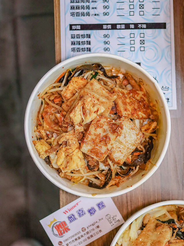 新竹比較少看到”角角”,所以路過的時候看到還滿驚喜;炒粿取名可愛,過去在北部是炒粿角、南部是炒菜頭粿,盈嘉則是用港式蘿蔔糕,還是特別用沒有加蝦仁的那種,所以對海鮮過敏也可以正常吃不用擔心。口味有原味、蒜香、麻辣和塔香四種,想喝湯還有牛蒡湯,除了粿之外也還有炒麵可以吃。
