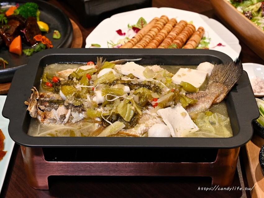 合菜中的招牌烤魚料理,糖糖點了川滬老鹹菜烤魚,採用整隻新鮮鱸魚,先過油,再加入自然發酵老鹹菜及青花椒熬製的湯頭,搭配百頁豆腐、虱目魚丸及黃豆芽菜,吃起來帶點酸度及香辣風味,裡頭的魚肉細緻鮮甜,其他食材也燉煮的相當入味呢