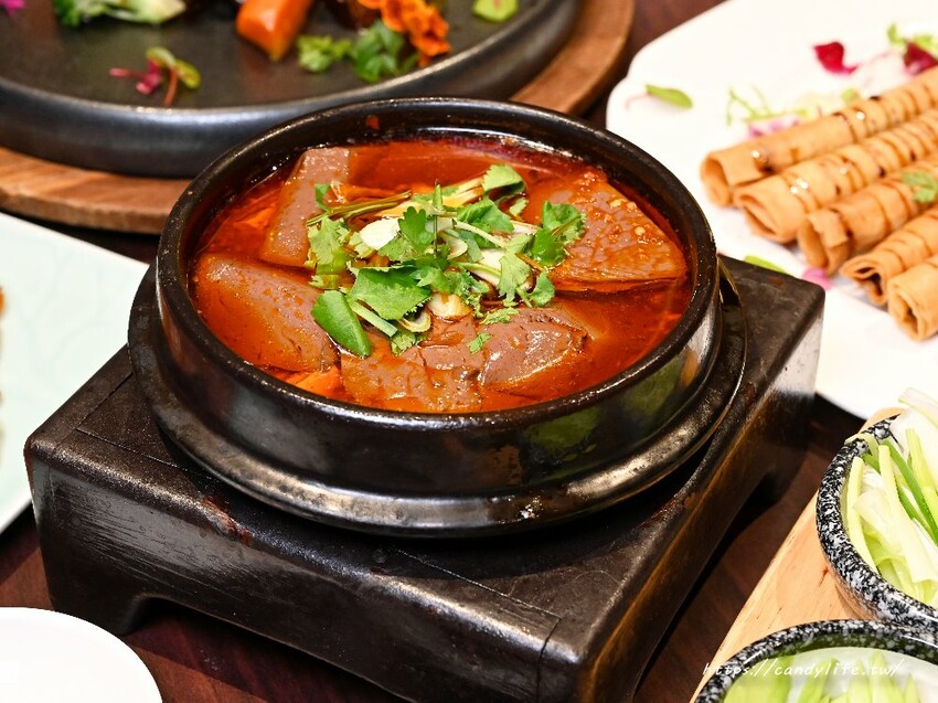 六人合菜的前菜可以任選兩種,糖糖選了麻辣鴨血豆腐及韭黃炸春捲,漢來軒的麻辣鴨血豆腐採用中藥材下去燉煮,辣度大概是小辣左右,裡頭的鴨血都是採用新鮮鴨血,口感軟嫩,燉煮的相當入味,豆腐則是採用口感較紮實的板豆腐,口感綿密,帶香辣滋味,單吃不鹹膩