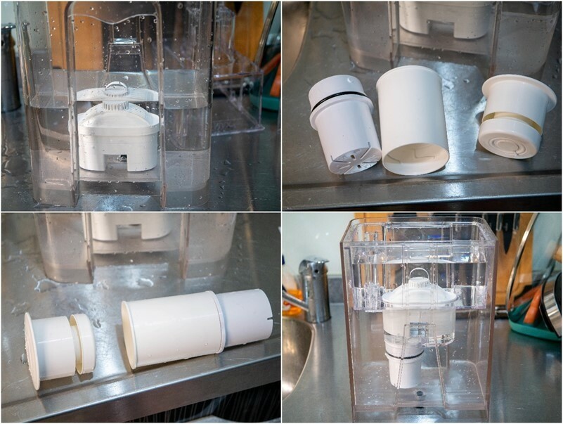 水箱主要有兩個區塊,分別為過濾前後的水,中間則是安裝濾心的位置