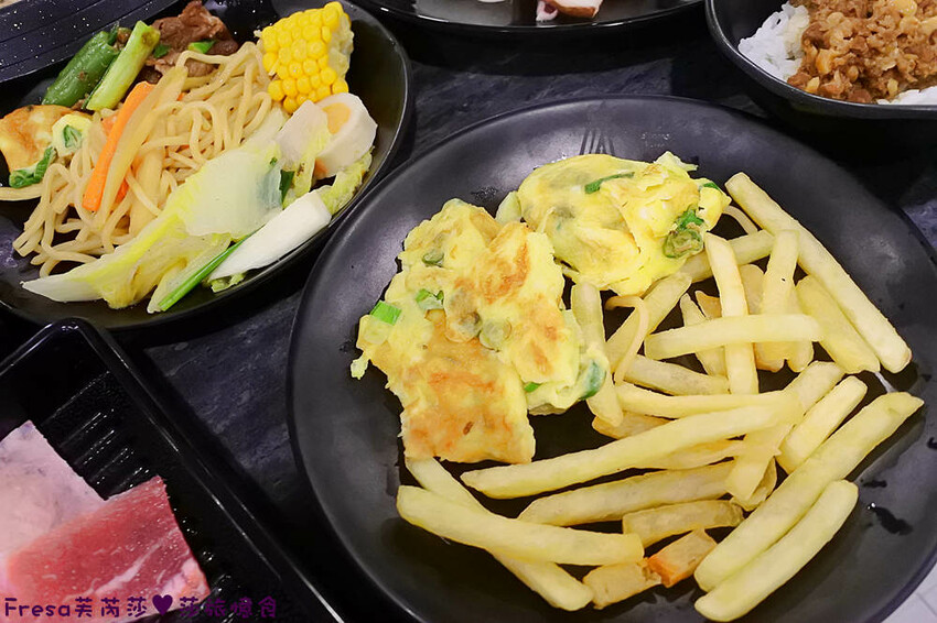 蔥花蛋、炸薯條,等待燒烤時,可先止飢一下.