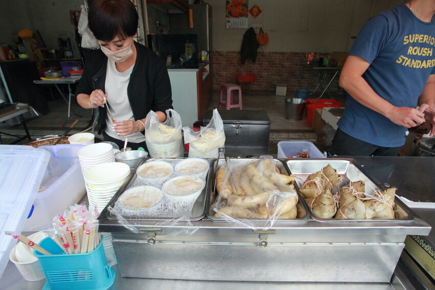 這攤位上有放置大腸、肉粽及碗粿給客人挑選。