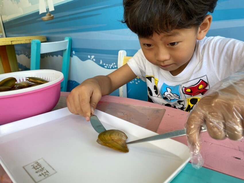 老師講述著珍珠形成的故事,屎蛋就像蚌殼醫生,仔細的檢查每一顆珍珠!