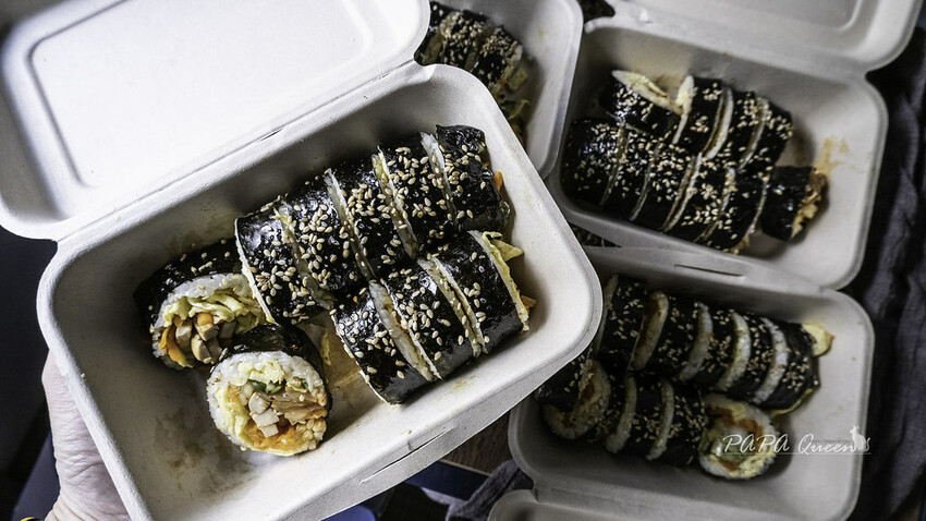 午食武士-就是韓式飯捲又跟其他店家不一樣的地方是這裡有切,選用熱飯捲起來後灑上滿滿的韓式香油與白芝麻,份量足管飽,無肉,純素/蛋奶素,小攤近向上市場-往不熱鬧的那邊走!