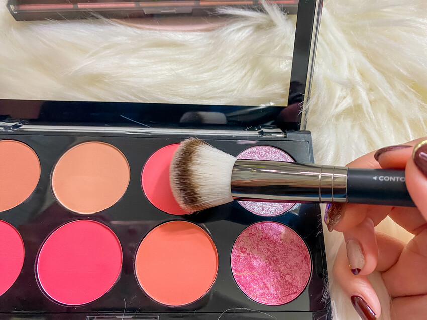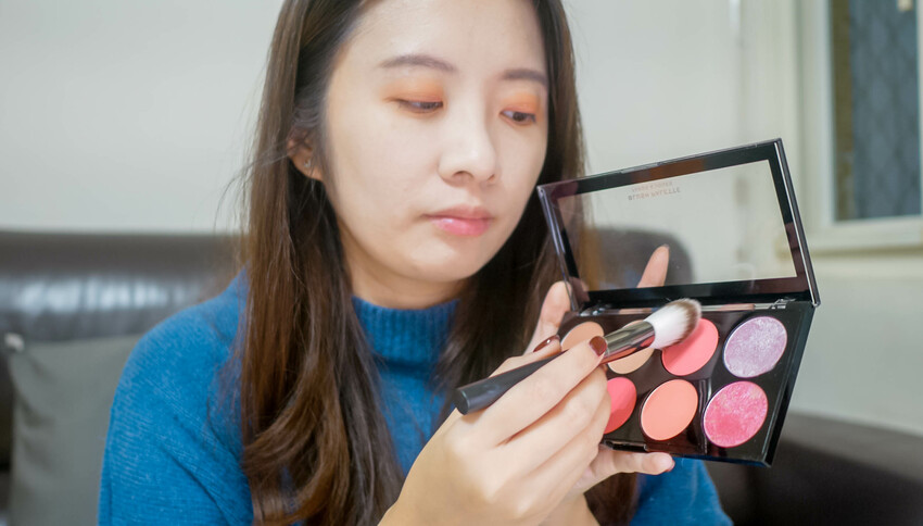 使用腮紅刷,沾取腮紅後,記得先在手背調整用量