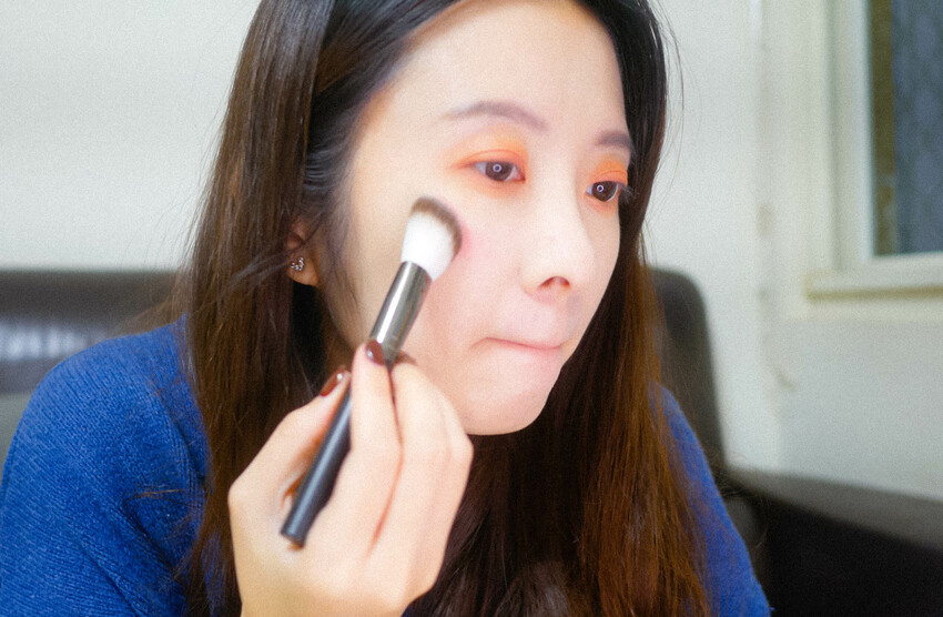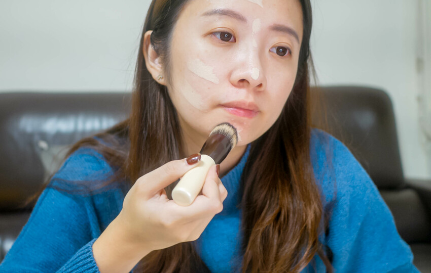 接著直接使用粉底刷或是美妝蛋給推勻開來