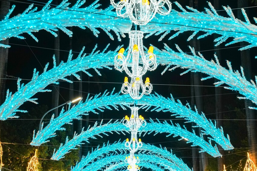 從公圓的椰林大道駕起一個個非常壯觀的燈飾牌樓