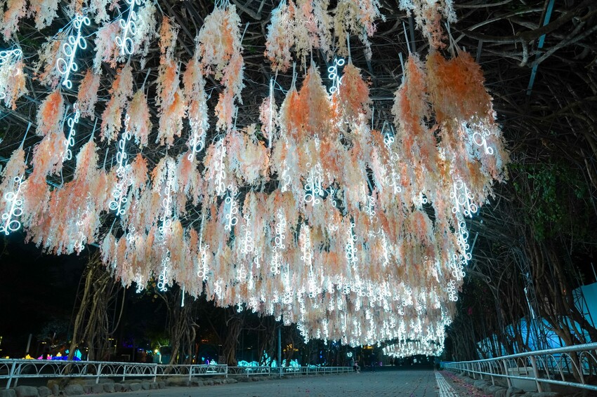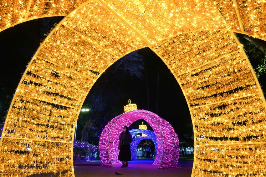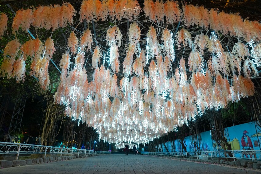 形成一個隧道,中間穿插著燈飾,若隱若現