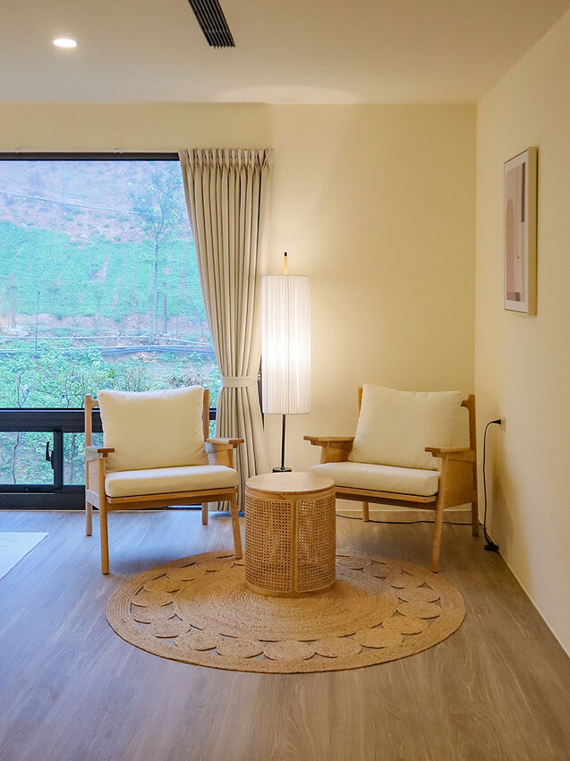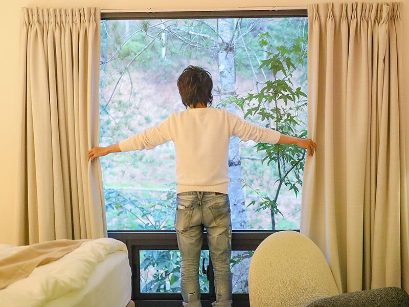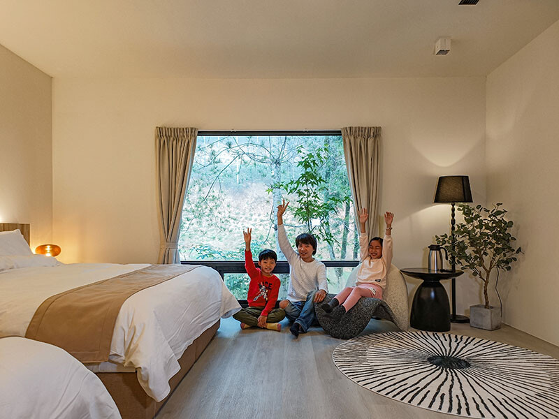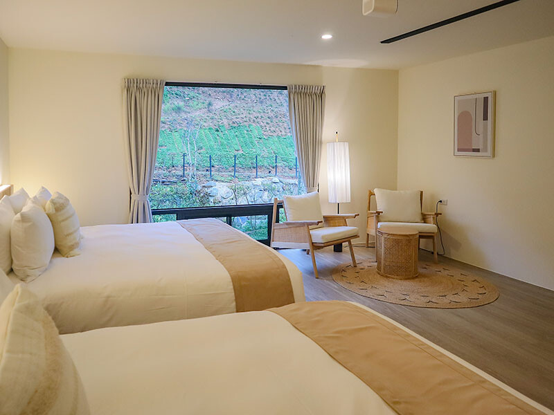 揭開窗簾,看到的是植披與林間溪水,這又是一個魔術;每個房型都有一個大對外窗,可以倚在窗邊透著日光,也可以坐在椅子上審文(身為社群管理員真的很不容易),但這都是另一番自在的風景。
