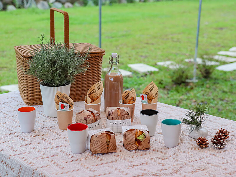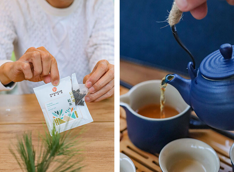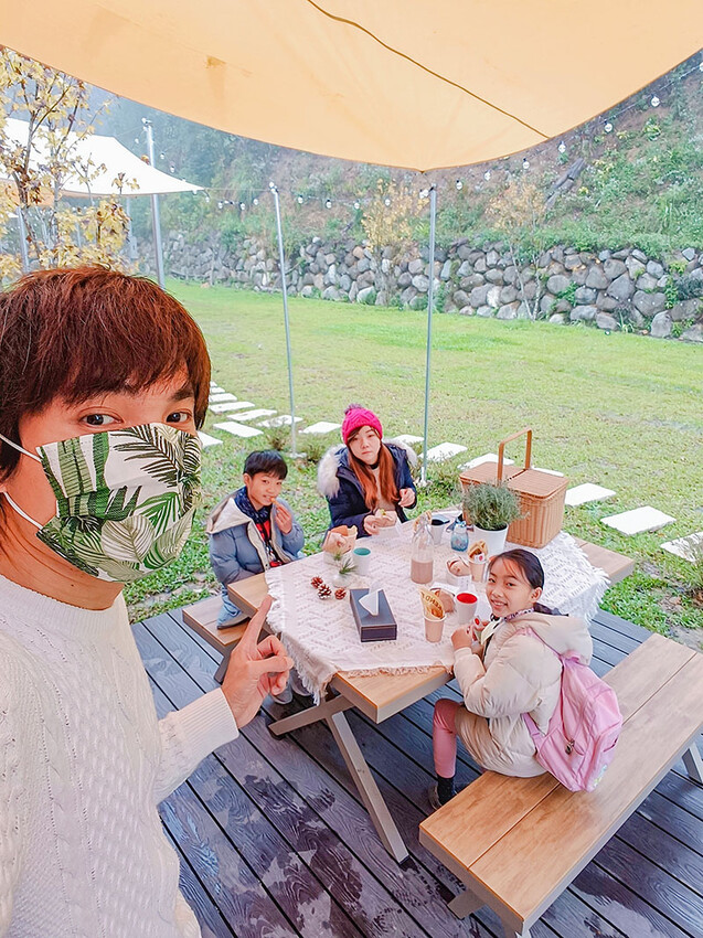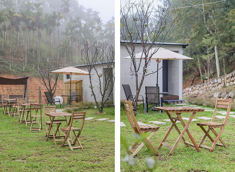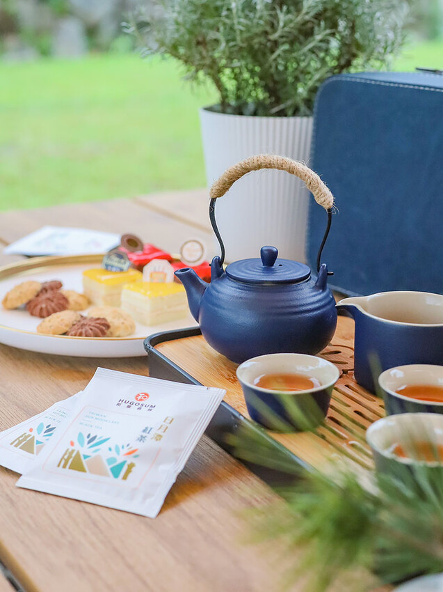 在地茶品搭配餅乾和小蛋糕,用這組精緻的茶具聞著茶香喝著茶,在林間也能這麼高級阿!