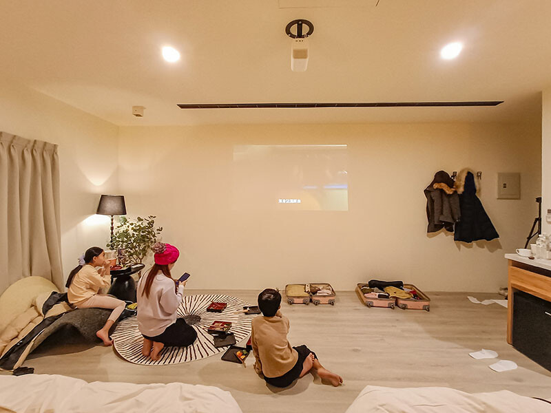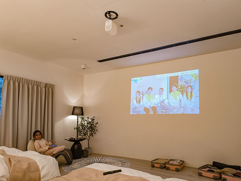 咦~不要誤會沒有電視喔,影音設備直接使用投影機在牆面投射,Netflix和Disney+直接點房型就可以免費觀看,偷偷跟你說,小花還特別帶了投影機來,如果不是想要移到戶外與其他帳一同觀賞娛樂,個人影音娛樂相當夠用。