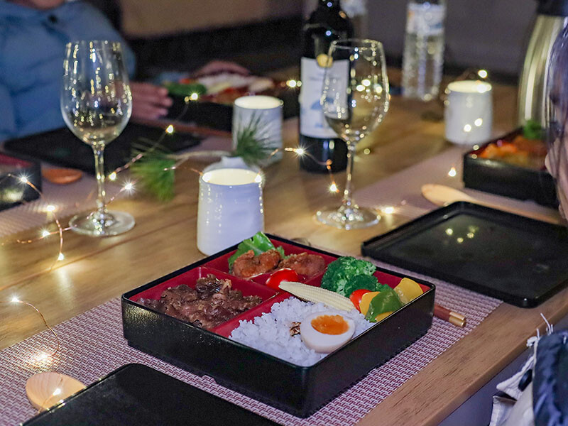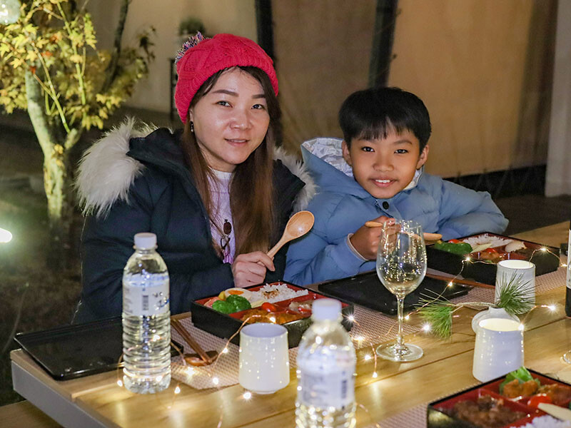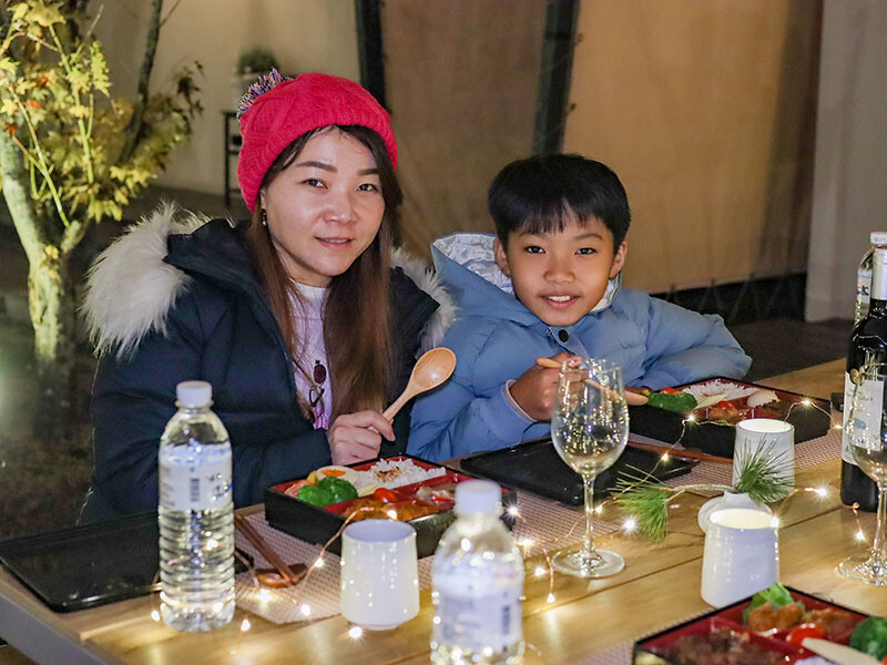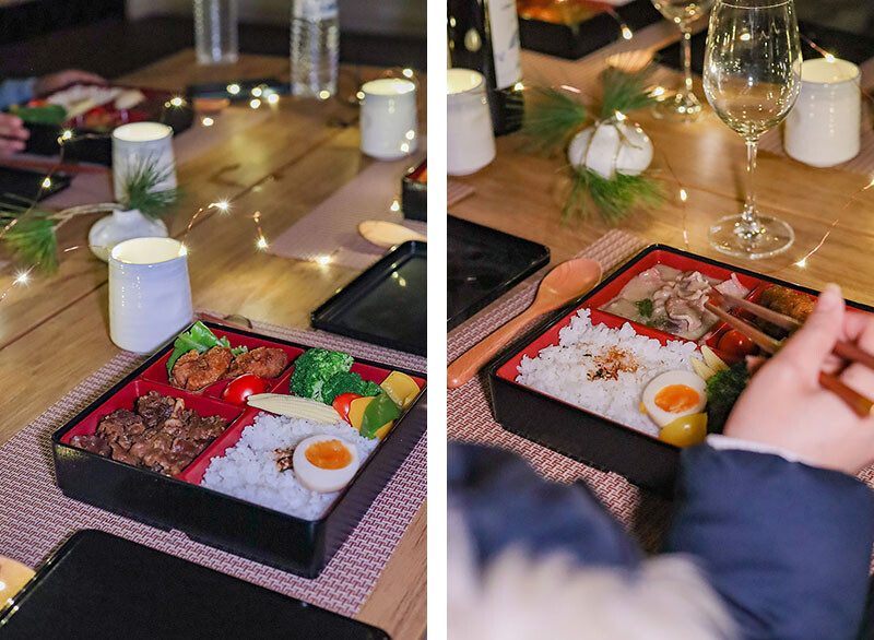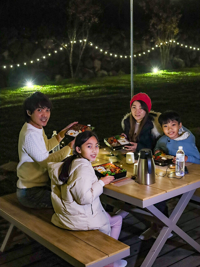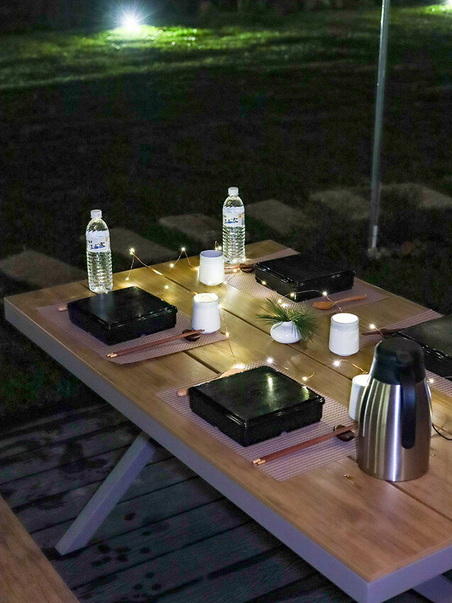 出來玩當然要有儀式感,更何況還是第一次野外住宿體驗,我帶來的星珠燈圍繞餐桌,把飯盒都擺好再喊著小草、小花們出來吃晚餐囉~