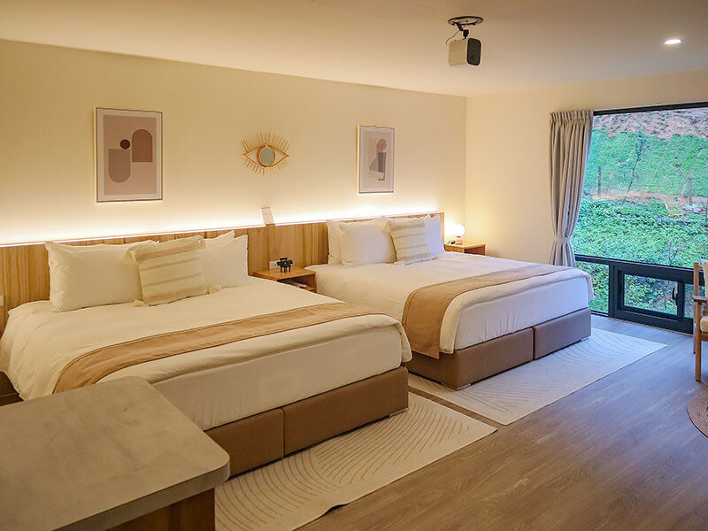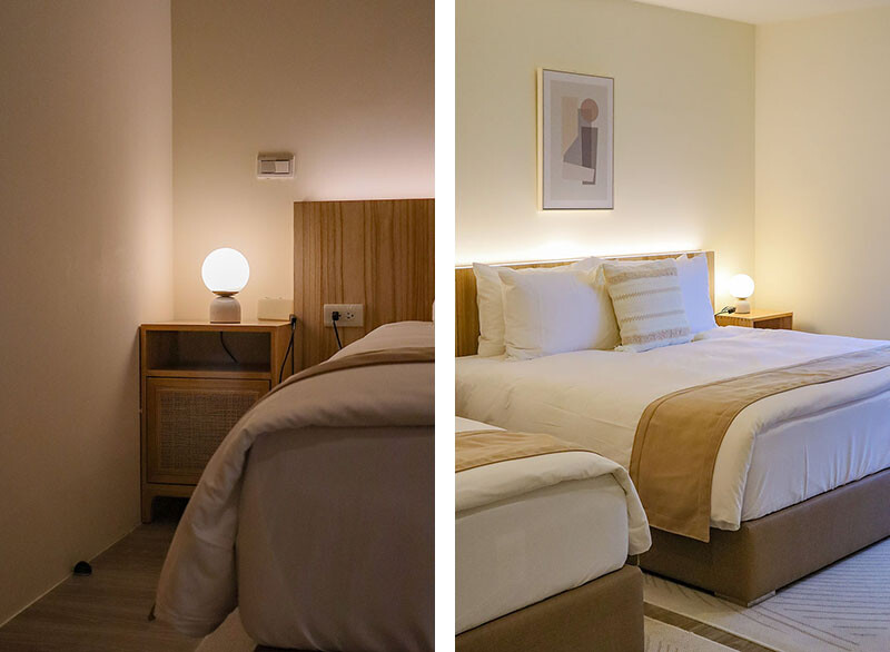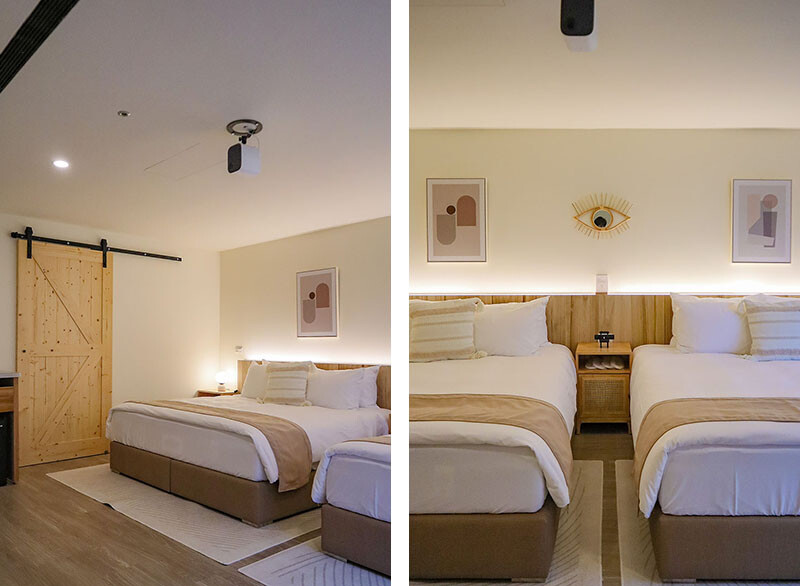 把遮風擋雨又方便的民宿房間搬到森林,可以享受野宿的樂趣又有科技的便利,來葉子祕竟就是這麼放鬆;從鄉野一秒到飯店,就像打開多拉a夢的任意門,四人房有兩張大床,尺寸來說有Queen Size級別,我和小花躺著都還有不錯的空間。