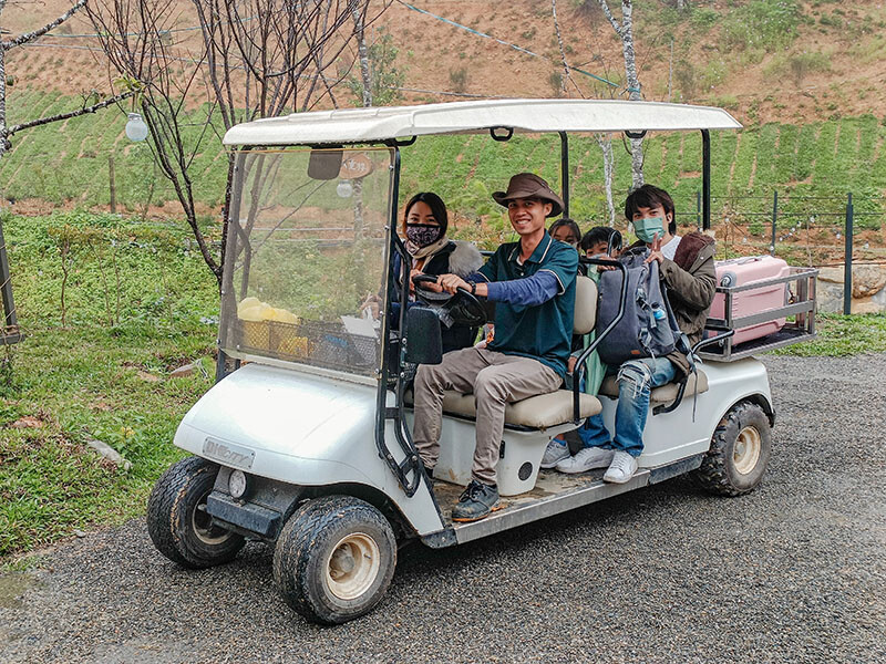 今天入住的是B區的青楓四人帳,自己拖著行李可就太累了,有管家開著球車幫我們連人帶行李一同載上去~