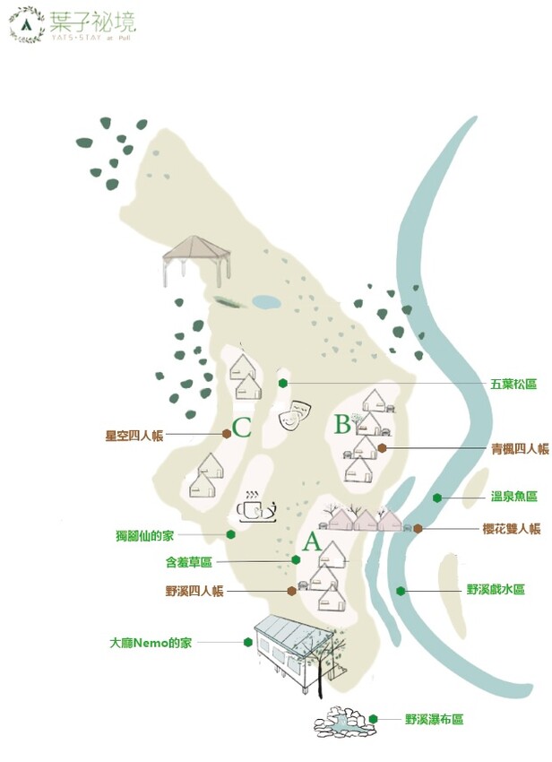 葉子祕境目前有三區,A(野溪四人帳)、B(青楓四人帳+櫻花雙人帳)已經完工,而C(星空四人帳+Villa)正在施工,相信日後不久就可以看見期待的Villa完工~