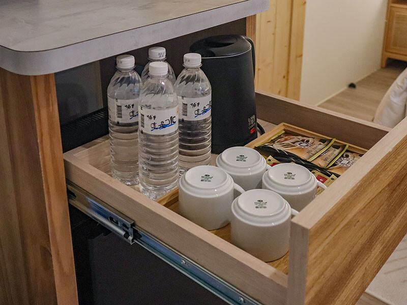 房間內有小冰箱和在地日月潭茶包、咖啡包提供:冰箱內有提供四瓶礦泉水使用,我和小孩的默契是在外過夜都會吃個泡麵當消夜(真是不好的旅日默契 XD),所以還跟京妹額外在跟管家多拿了水,然後才發現原來大庭旁有飲水機可以使用~但這也表示服務很貼心~