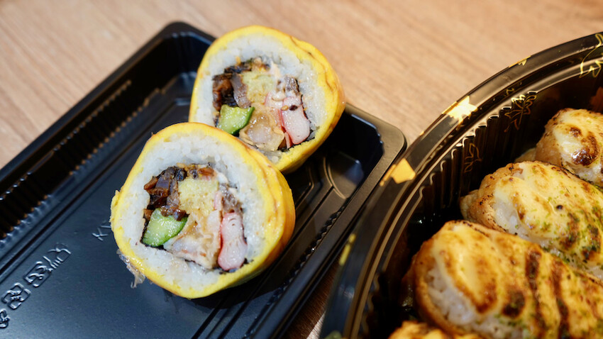 享稻壽司的壽司真的好特別,你們看這虎皮捲壽司,外面是虎皮蛋糕的虎皮,也是師傅自己做的唷~吃起來鹹甜鹹甜,很好吃。