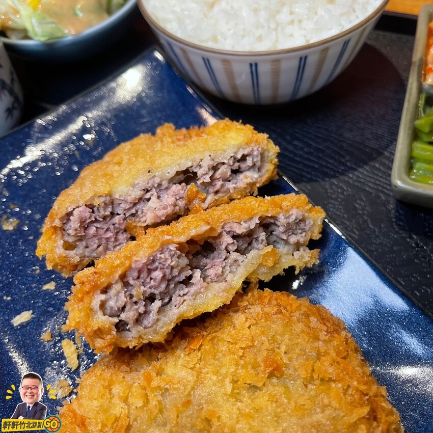 炸漢堡排軒軒也很推薦,一口咬下厚實有汁,而且絞肉肥瘦適中,口感不乾不硬