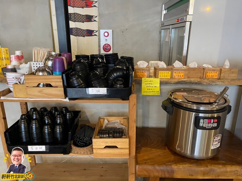 後方有味噌湯、麥茶、碗筷餐具可以自行取用喔。