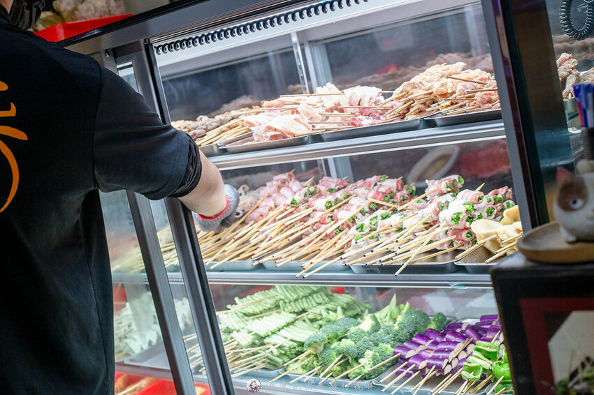 《柒串燒屋》長安總店晚上真的人有夠多的,七點多到有大概等一下下才有座位,用餐空間是比較擠一些些,會給你籃子放包包,然後《柒串燒屋》它們家的特色就是把所有串燒的食材都擺在門口,所以在這邊點餐你可以用菜單也可以直接到門口外面的串燒櫃直接拿,重點是每樣食材看起來都很新鮮衛生,處理的相當好,感覺每一樣都想試試看。