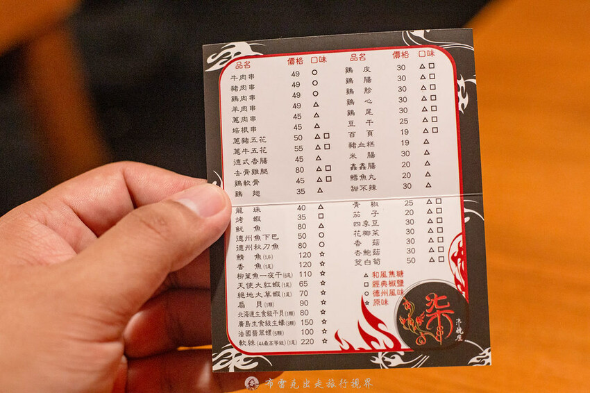培根串 NT$45元/豬五花串 NT$50元/牛五花串 NT$55元