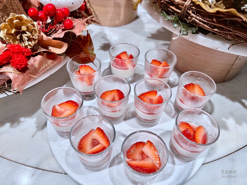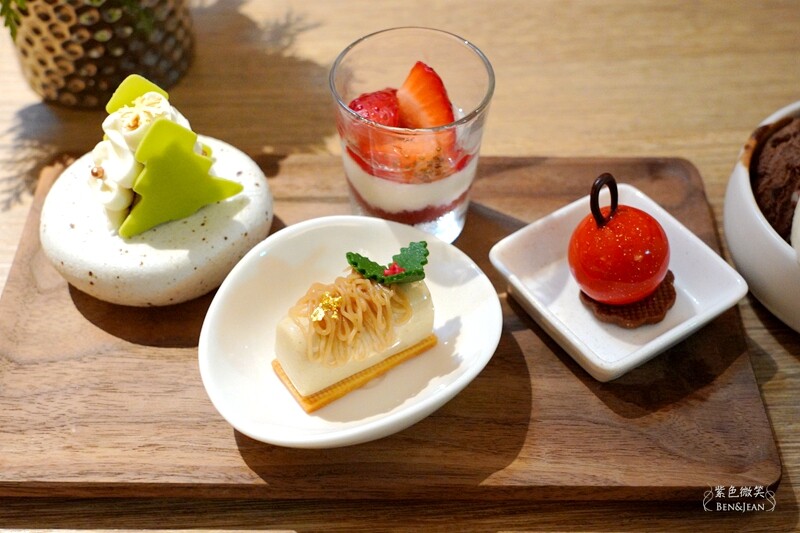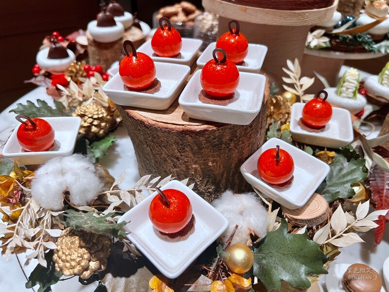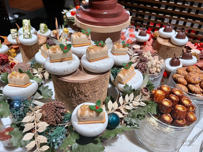 因為現在是聖誕節的季節,所以非常有聖誕味。正中央的甜點台,擺滿了馬卡龍、可麗露、奶酪、小蛋糕等~~精緻又可愛