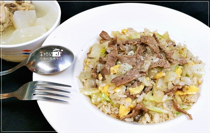 這道炒飯是解決飢腸轆轆的快速料理,白飯牛肉片加上不容易出水的青菜一起拌炒,看起來簡單的炒飯有大廚的風味喔~
